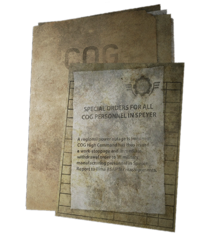 Tras la caída de la Presa Tollen, el Alto Mando de la CGO emitió una orden de suspensión al personal militar con responsabilidades de producción en Speyer, a lo cual se emprendió la evacuación de todo el personal, tanto civil como militar. La reubicación fue designada en la ciudad de Ilima, para que el personal pueda ser reasignado. Se desconoce si la Horda Locust atacó la ciudad de Speyer.