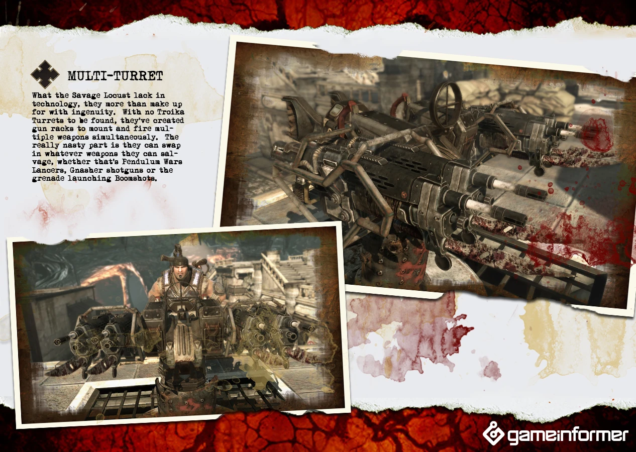 | “ | Lo que a los Locust Salvajes les falta en tecnología, lo compensan con creces con ingenio. Sin Torretas Troika, crearon bastidores de armas improvisados para montar y disparar varias armas simultáneamente. Lo realmente interesante es que pueden intercambiar cualquier arma que puedan recuperar, ya sean Lancers de las Guerras del Péndulo, Escopetas Gnasher o Lanzagranadas. | „ |