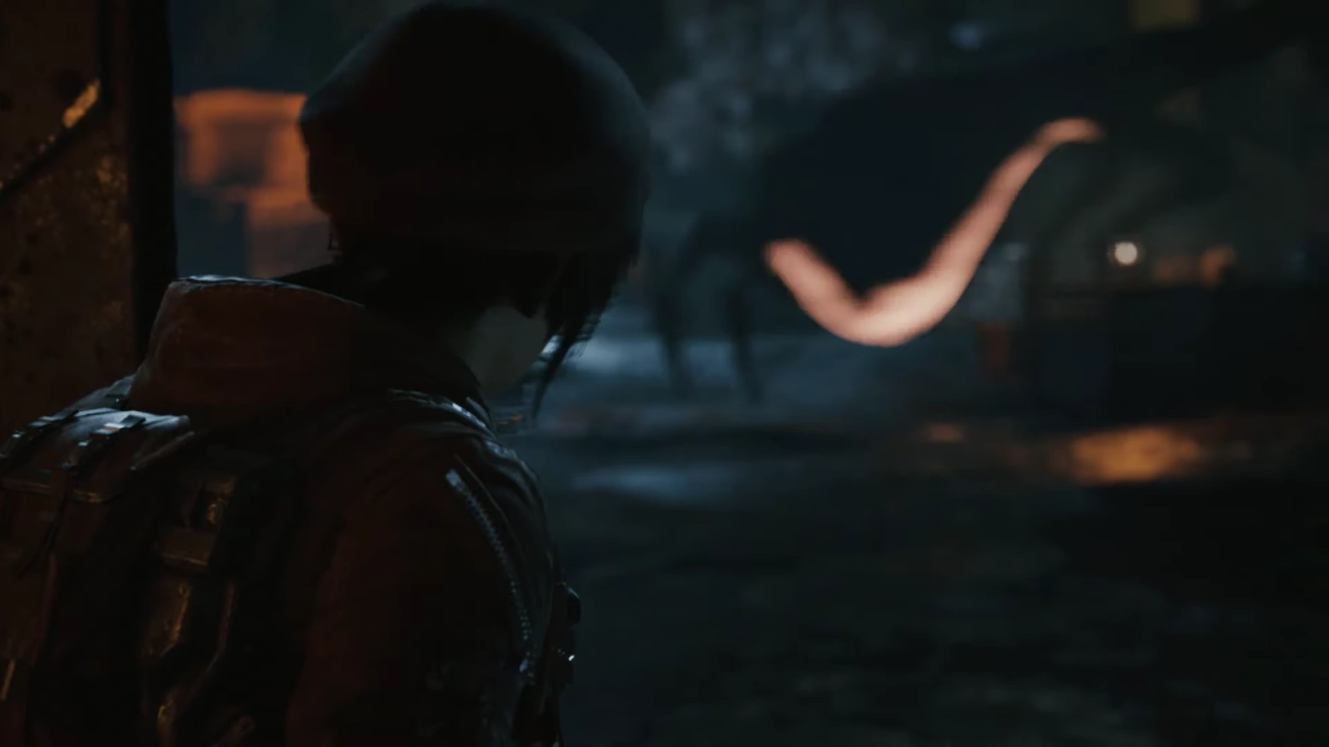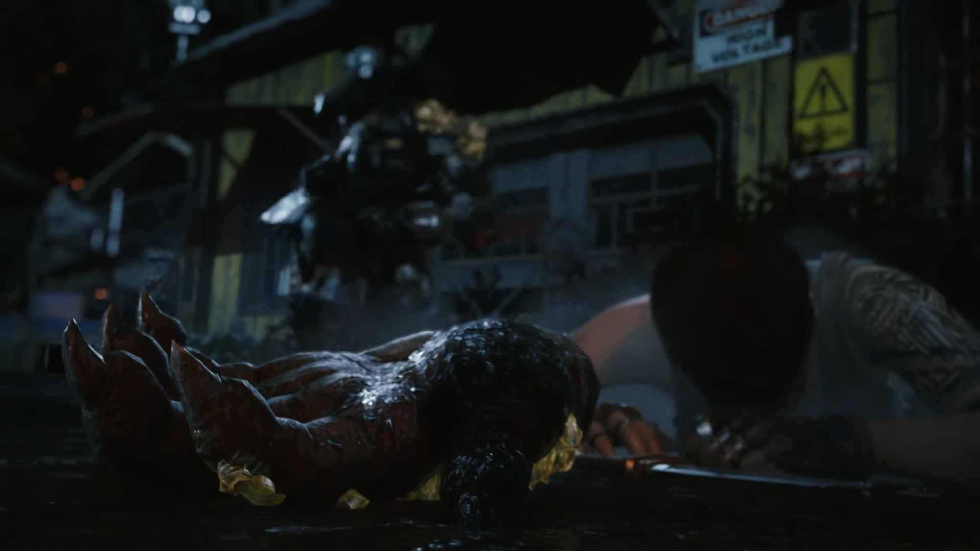 While Kait and her friends tried forcing the door to open, William, visibly frightened, approached the workshop, begging the trio inside to let him in, only to be taken by one of the arachnids in an instant. Outside, the humanoid approached Reyna again. She managed to get up and stab it in the abdomen, causing the creature to lose its balance. She attacked again, aiming higher, but it managed to block her attack. Holding Reyna by her wrist, it turned around, causing Reyna to drop her machete and tossed her at the door of a barn. Reyna hit the ground again and tried to crawl away from the coming attacker. When it was a feet away from her, Oscar appeared behind it and fired his Gnasher at the creature, trying to save his sister-in-law, telling her to run. Unaffected by Oscar's attack, it turned around and grabbed Oscar by his left wrist, crushing it, which caused Oscar to fall.