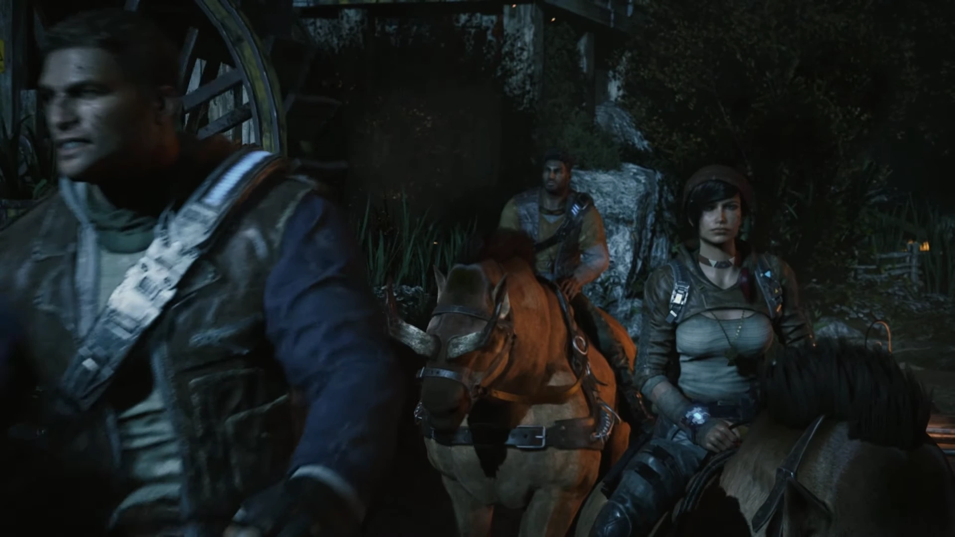 Right after the attack ended, Kait managed to open the door with a Boomshot she printed using the fabricator. The three rushed out of the workshop. While Kait run off to search for her mother and the others, Del remarked that it "sounded like there were dozens of 'em. Hundreds. Like a... like a 'swarm'" - The group would refer to the creatures using that word, which later was even adopted by the COG. JD spotted the amputated hand of the humanoid that assaulted Reyna, picked it up and after inspecting the limb he cut one of its crystal growths off in order to take it as a proof of the attack. Meanwhile, Kait found the broken machete that belonged to her mother and took it with her. Then, she noticed the spooked horses, ran toward them and mounted one, telling her friends they need to chase the creatures. JD tried to reason with her, telling her they do not know where the abductors went and suggested contacting First Minister Mina Jinn, believing only she had the resources required to handle such situation. Del joined the conversation, suggesting traveling to the Stroud Estate and asking JD's father, Marcus Fenix, to help. After a few moments of convincing, JD gave up and agreed with Del's idea. The three rode off, headed for the Estate.[1]
