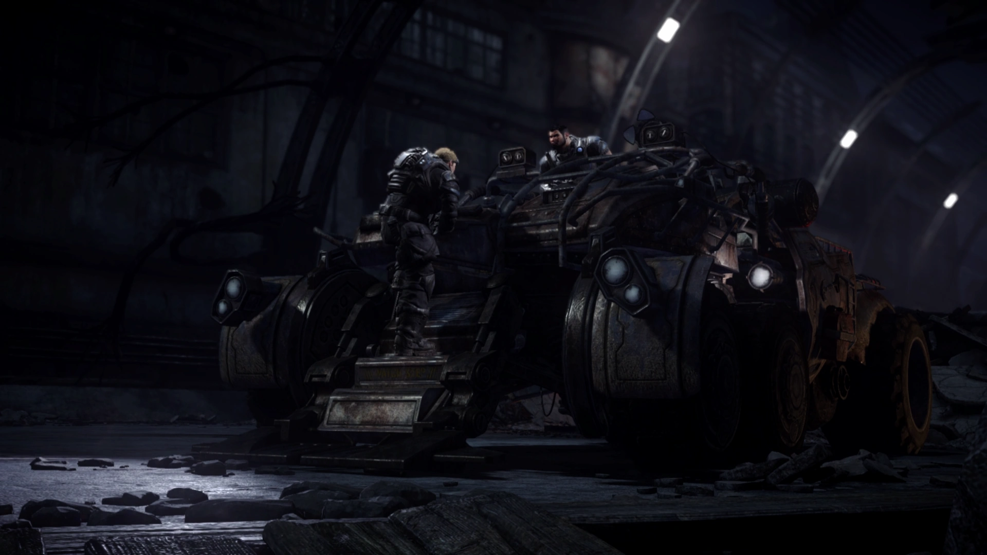 Cpl. Dominic Santiago then advised that they procure a Junker from a nearby Stranded leader named Franklin Tsoko, who was employed by Cpl. Santiago to help search for his missing wife, Maria Santiago. The Junker was an APC fitted with Ultra-Violet Turrets to defend against the Kryll during the drive in the night. Upon arriving to Franklin's outpost, Cpl. Santiago met with Franklin and obtained the keys to the Junker, but it still had to be acquired and filled at Aspho Gas Station, owned by Chaps. In addition, Tsoko demanded that Cpl. Santiago's squad mates Pvt. Augustus Cole and Cpl. Damon Baird stay with Tsoko and protect the camp until Cpl. Santiago would return.
