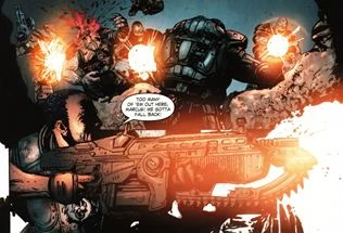 When it was discovered that the Locust were attempting to cut off access to the North Gate Agricultural Depot, it was decided to evacuate the facility. Cole and Delta-One, joined by Col.Victor Hoffman, Bernie, Pvt.Federic Rojas, and Pvt.Tai Kaliso, were to use three Armadillos to guard the convoy. Before the convoy got under way, Bernie showed Cole her cat-fur lined boots, which he found hilarious and fascinating. Cole rode in APC-Three, which was at the rear of the convoy, along with Baird and Bernie, with whom Cole had become quick friends with.[35] During the ride, Bernie and Baird taunted each other, while Cole tossed some ration bars out of the APCs hatch to some starving Stranded children. Baird told him not to waste his rations on them, but Cole shot back that Baird grew up rich and never knew what it was like to be poor and hungry. Baird let him keep throwing the rations out, and Cole said that they only hated them because the Gears got more to eat than them. Baird told him it was because they had to fight, but Cole told him to tell that to the next eight year old they saw, which shut Baird up. When Bernie heard Anya Stroud over the radio, but was unable to figure out who it was, she asked Cole who she was. He told her, and Bernie quickly remembered her.[36] When they arrived at the depot, they were directed on where to park their APCs by Staff Sergeant Lennard Parry. He then helped some of the sappers move crates onto the trucks.[37]
