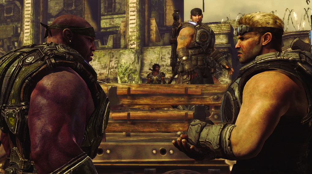 After leaving the area around the Tomb, they come to crossroads. Cole and Dom go one way, while Marcus and Baird go down the other. Cole talks about wanting to find some Locust and ruin their day, which causes Dom to ask him if he ever gets tired, to which Cole replies "Hell to the no!". They then encounter two Boomers, but manage to kill them in a crossfire. As they move onwards, they walk into a room and find a Corpser, which retreats. Marcus and Baird argue about what the Corpser is doing, much to the amusement of Cole and Dom. After fighting through a group of Locust and regrouping, Dom reveals his plan is to borrow a Junker from a group of Stranded. They fight their way to the Stranded camp, where the gatekeeper lets them in. Dom convinces the camp's leader, Franklin Tsoko, to let them borrow the Junker, but only under the condition that Cole and Baird stay as collateral.[11] While at the camp, one of the Stranded realized who Cole was, and all the Stranded started talking to him about Thrashball, and getting him to sign autographs. The next time Marcus contacted Cole, he told Marcus that the Stranded were bringing out their big guns and that something was about to go down, and Marcus told him he would return as soon as they could. He and Baird were then contacted by Lt.Anya Stroud and told that Locust were closing in on their position. They then came under attack from Locust and Kryll.[12] They were in danger of being overrun when Marcus and Dom finally made it back, and helped them defeat the attacking Locust. Cole and the others got into the Junker and headed for the Lethia Imulsion Facility[13]
