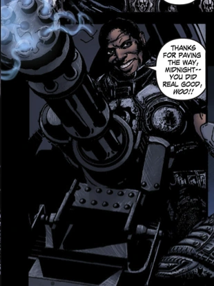 Fourteen years after E-Day, Cole was a private in Alpha Squad with Pvt.Damon Baird, Jan Rojas, and Gyules. During Operation: Midnight, Cole manned a side gun on a King Raven, providing cover to Midnight Squad from a squad of Theron Guards. He congratulated the Gears in Midnight for holding the Ferro Bridge long enough for the convoy to arrive.[6]