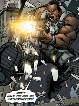 Private Augustus "Cole Train" Cole, also known as Gus or his Thrashball nickname "Cole Train",[2][3] is a Gear in the COG Army and a former Thrashball player. Best known for playing with the Hanover Cougars as defensive lineman, Cole later joined the army as a Gear after his parents were killed by the Locust Horde on Emergence Day. His announcement of retiring from Thrashball and joining the war effort caused a massive spike in enlistments. During the majority of the Locust War, Cole fought alongside Cpl. Damon Baird. Cole rejected every military promotion that had been offered under the grounds that having rank was not going to affect how many Locust he could kill.[4] As part of Delta-One, Cole became part of the most reliable squad of Gears available to the COG, fighting on the frontlines of every major operation near the end of the Locust War, and continued fighting for the COG as part of Delta after the relocation to Vectes, fighting Stranded Insurgents, the new threat of the Lambent Pandemic and the rise of the Swarm.