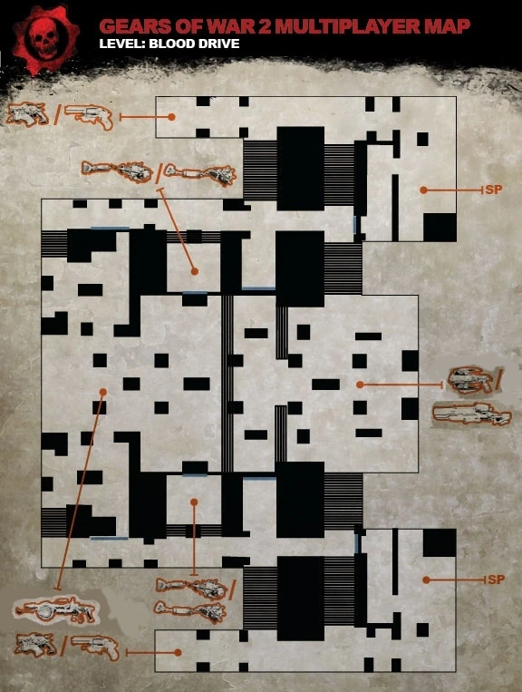 Blood Drive is a symmetrical map introduced in Gears of War 2 and appearing in Gears of War 3 and Gears of War: Judgment. It returns in Gears of War 4 as part of a free map DLC that Season Pass owners could play exclusively from January 10th, 2017. It became available to all players on January 17th, 2017,[1] but is only available for private play if the Season Pass has been purchased or the map is separately downloaded.