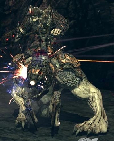 Bloodmounts were first re-encountered during the Battle of Anvil Gate, where several of them passed through the main gates after a Siegebeast destroyed the front doors, before being destroyed by Gears wielding Vulcan Cannons.[11] The next day, as the Gears tried to reach the city of Mercy, several Bloodmounts attacked their Rat Trucks while they were stuck in a sandtrap but were torn apart by Vulcan Cannons yet again.[12] They encountered the Gears again at the Endeavour Naval Shipyard while searching for fuel and a rotor to repair the CNV Adamant. They were taken down by a Hammer of Dawn targeting laser inside the dockyards.[13] At Azura, they attempted to stop them from taking down the Siegebeasts at Acanthus Train Station but didn't succeed. They later attempted to stop Delta from reaching Pinnacle Tower but failed to do so. At the tower itself, they tried to stop Delta from reaching the elevators that led to the top floor but were slain by them.[14]