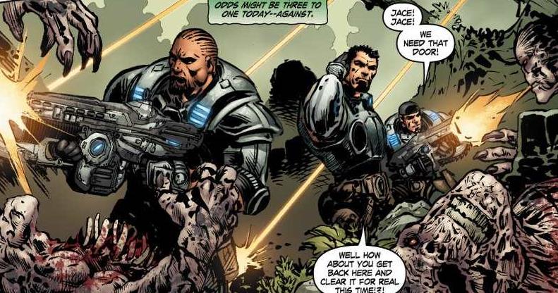 A month after the Evacuation of North Gate, Bernie, Baird, and Cole had all been transferred out of Delta, and rookie Gears Pvt. Jace Stratton and Pvt. Gil Gonzalez were assigned to the squad. Delta was then sent on a mission to the Pirnah Badlands to try and locate missing squads and recover supplies. Three weeks into the mission, they hadn't found a single survivor, but had found a lot of COG tags and supplies. Dom split off with Gil to explore one section of a ruined town while Marcus and Jace searched another section. They found Cpl. Michael Barrick from Echo-Six inside a building, and also encountered Locust resistance. They killed the Locust, shooting the last one out a window, and they spotted Marcus and Jace approaching the building. Dom called out to them to see what they had found, and the three Gears climbed down the building to rejoin the others. Barrick reported that the rest of his squad had been killed, much to their disappointment, and Marcus told Dom to sweep the area and grab whatever he could find, and that he would get the APC ready to go in five minutes. Before he began looking, Dom, introduced Barrick to Jace and Gil. Dom found some supplies, and loaded them onto the APC when Marcus returned, and the five Gears began driving back to Jacinto. They stopped for the night in the ruins of a building, and Dom and Barrick checked the west perimeter of the area while the others checked the others to make sure they were secure. After they finished scouting, the Gears built a fire and settled in for the night, and Dom told stories of the Lethia Imulsion Facility to Jace, Barrick, and Gil. Jace said it sounded like it was crazy, and Barrick said that he never wanted to go underground with them. Dom said he didn't have to worry about that, and that he didn't want to go back underground anytime soon himself. They then went to sleep to get ready to finish the drive back to Jacinto the next day.[10]