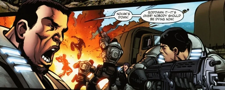 Dom and the other Gears began celebrating, but were stopped and shocked when they were shelled by an Indie unit in the mountains. Several vehicles were hit and some shots hit the town below, and Dom remarked that this was insane and that someone needed to tell the Indies they had surrendered. Marcus reminded him that they technically hadn't yet, and they joined in with the rest of C Company in opening fire on the Indies while their commander tried to get the Indies to surrender. Several mortar shells hit near Dom and the others, and he saw Novak go down. Dom began cursing in frustration, saying that no one should be dying now since the war was over. A few moments later, the Indies did stop firing, having received word from their superiors that the surrender was real and not a COG trick.