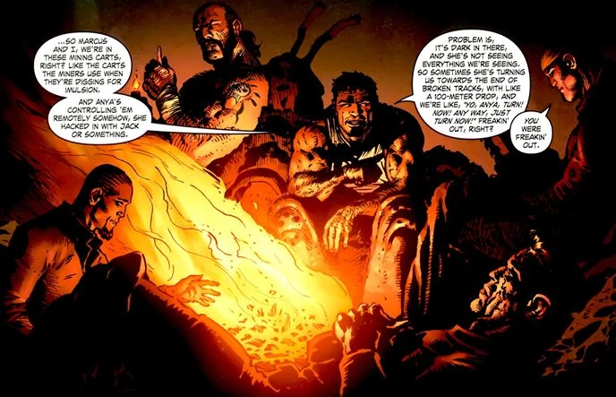 At the facility, Dom and Marcus reconned the buildings. There they discovered the Sires and clues that led them to Mount Kadar, where they reentered the Hollow. Upon entering, they found Chaps and his group of Stranded, who were surprised by their appearance. Dom recognized Chaps for helping them in Ephyra, and showed him a picture of Maria. Chaps immediately recognized Maria as part of Stu's group, but they were captured. Despite this, Chaps told them the location of the work camps. Dom immediately set off to rescue his wife. Marcus initially objects to this, wanting to continue on with their mission but Dom convinces him to help after reminding him he did exactly the same thing for his father.