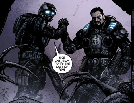 - Writer Joshua Ortega has stated that he came up with a story explaining how Gil got the large scar on his face, but won't reveal it since he's saving it in case he writes another Gears story.