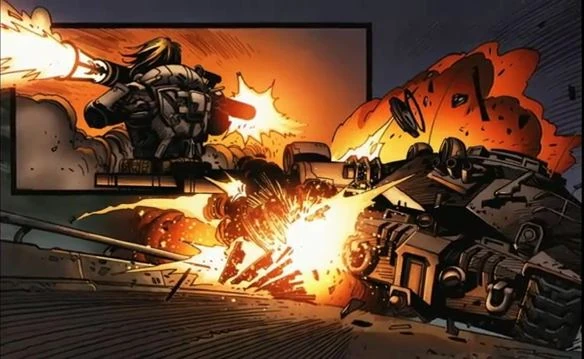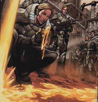 After arriving at Ragani, the company set up fortifications in an old building next to the highway leading into town, and Adam tasked Helena with evacuating the remaining civilians before the Indies arrived. When they spotted them, they discovered that there were only four APC's, instead of the eight heavier vehicles they were told to expect. Collins thought that the Indies had changed their mind, but Helena suspected that Intel was wrong, as usual. However, she was worried about where the other vehicles might be if they did exist. Adam began wishing for an orbital defense platform that would be able to track and destroy things like that, and Helena suggested he make that his first research project. Adam gave the order to open fire on the Indie vehicles, but Collins missed his first shot, and the APC opened fire on the Gears position, wounding several of them. The next two RPGs took out two of them, and the others retreated. Helena listened in on the comms as Adam contacted Choi, and asked what was going on. Choi informed him that those were just scout vehicles, and that at least twenty more Indie vehicles were coming, including tanks. Helena informed Adam that they had enough armor-piercing rounds to take out the APC's, but they did not have the weapons to take out tanks. She began working making Molotov Cocktails that could be dropped into them at close range. As she worked, she spoke with Adam, encouraging him to take the job and watch Marcus grow up. He asked her if he would be letting the regiment down if he took it, but she encouraged him to follow his conscience. He then asked her who looked after Anya while she was deployed, and if her father was around. She informed him that Anya's dad was not around and never would be, and that his identity would remain her own personal business. The Indie armor then arrived, and Helena was worried to see a Pariah Tank leading them. Helena suggested somebody get in close and drop the Molotov's into the tanks vents, and Adam decided he would do it, along with Collins. He ordered Helena to keep the rest of the Indies busy, and she asked if he was trying to prove something by taking the risk. As Adam and Collins began making their way to the tank, Helena organized the defense, ordering several Gears to assist Pvt. Kinnear, the company medic, and took an RPG from another Gear. She used it to take out some of the Pariah's tracks, immobilizing it, so that Adam could get close finish it off. He succeeded, but was wounded when a machine gunner hit his knee. Helena sent Kinnear out to provide aid to him, and then watched as the Andius Fusiliers arrived and began taking out the rest of the Indie armor. She contacted Hoffman to inform him, but he was too distraught about the casualties they had suffered to care. As she helped tend to the wounded, Helena remarked to some of the other Gears how Adam would never be able to handle losing men, and that he would probably take the job at the DRA.[9]