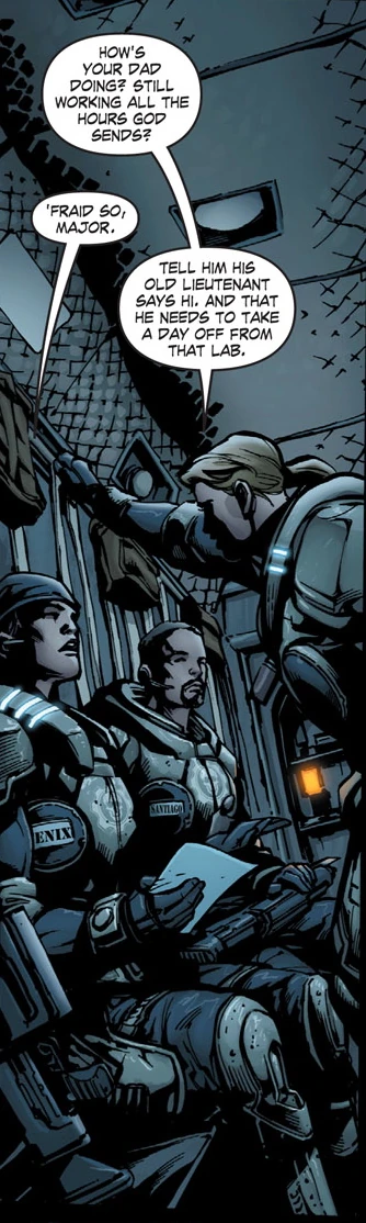 While in Howerd Company, Helena was close friends with her commanding officer Captain Adam Fenix and served as his second in command. She was very loyal to Adam and fought alongside him during their tour duty. Helena would be an open ear for Adam about his doubts on how the Pendelum Wars would be fought as well as talk about wanting a better future for their kids Marcus and Anya. When Adam was offered a government job to develop weapons he believed would help end the war faster, Helena encouraged Adam to take it and see his family again despite his guilt of leaving his Company behind and explaining that none of his men would blame him for taking it. She would inquire about him years later when Marcus went on his first tour of duty under her command and asked him to tell Adam that she said hello the next time Marcus saw him.