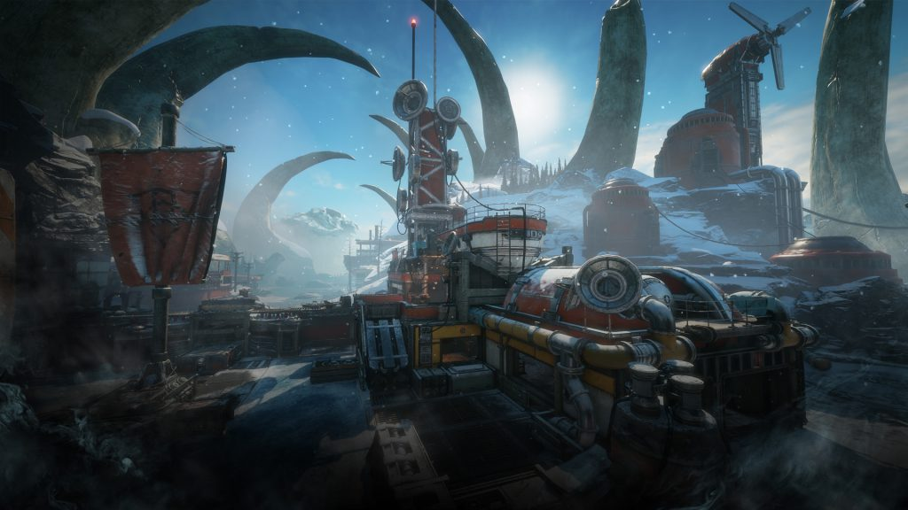 Icebound is a multiplayer map in Gears 5. It is set in an Outsider trading post built on the shores of a frozen lake amidst the skeleton of a Riftworm. Chunks of the frozen lake surface can be destroyed during combat, exposing freezing-cold water that can slow, damage, and even kill those who try to wade through it.[1][2]