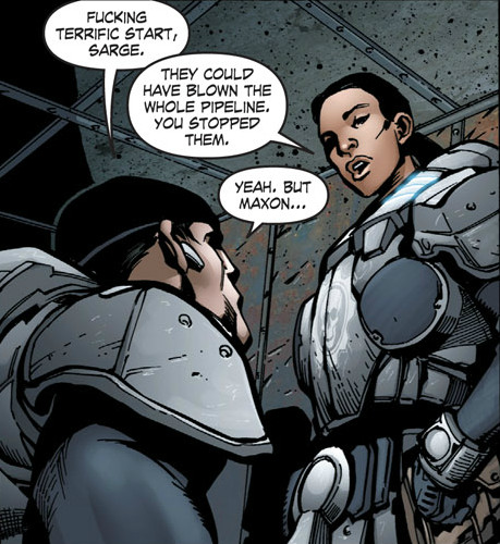 Two nights later, Marcus and the others were assigned to do a night patrol around the fields. As they walked among the pipelines, Carlos said that he wished somebody would shoot at him to get the waiting over with. Marcus told him they would enter battle eventually, and that he just had to be patient. Carlos told him he was worried that he would freeze up, but Marcus assured him that drill would kick in and he would shoot back. Maxon then contacted them and asked them where Quinn was, and Marcus told him he was with them. Maxon ordered them to meet him at the north perimeter gates, because one of the drillers claimed to have heard a bike near there. The three of them hurried to meet Maxon and began searching for signs of an intruder. Marcus told Maxon that he didn't hear anything, but Maxon stopped him and said there was someone else out there, and called in to control to report a possible contact. They then saw a motor bike zoom out from under a pipeline, and opened fire on it. However, more Indie soldiers appeared and opened fire on the Gears, causing them to take cover behind some pipes. Maxon was hit in the throat, and Marcus told Quinn to see to him, and asked Carlos to give him some covering fire. Carlos told him he was crazy, but Marcus told him to just do it, and jumped over the pipe and charged at the Indies. He shot two of them, and a Packhorse arrived, driven by Sgt. Bernadette Mataki and with Sgt. Daniel Kennen on the gun. Kennen ordered him to get down, and he fired on the rest of the Indies with the gun, cutting them down. Kennen asked him if he was okay, but before he could answer, an explosion from the other side of the facility lit up the night. Marcus realized the Indies had blown up the Imulsion wells, but Bernie told him not to worry about that, and that they had to get Maxon help quickly. Marcus helped Carlos load Maxon into the Packhorse, and asked him not to mention this to his dad, and Carlos reassured him he wouldn't. Marcus waited at the medical building to see if Maxon would be okay, but Bernie eventually arrived and told him that Maxon hadn't made it. Marcus remarked that it was a "fucking terrific start" to his first tour of duty, and Bernie told him that he had stopped them from blowing the pipelines. Marcus protested that it didn't matter since Maxon had been killed, but she interrupted him and said that they lost people and it would never stop hurting, but that they had a job to do, and had to go back out every day until it was done. Marcus told her he understood, and she told him that he and the others had done a good job, and told him to follow her. Bernie led them on the remainder of their patrol, and Quinn remarked that the damage would be repaired in just a couple of days. Marcus looked at the burning fires and remarked that this was all for just keeping the lights on back home, but Bernie told them to stop talking and finish the patrol.[11]