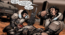 A week later, Marcus was out on another patrol with Carlos and Quinn in a Packhorse. Quinn told Marcus that his dad should try inventing an alternative to Imulsion, since if they increased the fuel supply, nobody would have to fight over it. Carlos pointed out that all the alternative fuels from the past had had wars fought over them as well, so it likely wouldn't do any good. When control reported that Khimeras had been detected along the border, they pulled over next to some pipelines and tried to see if they could spot them. They couldn't, and as Quinn climbed onto a pipeline to try to get a better view, he asked Marcus what he thought they were doing. Marcus told them they were just assessing their strength, and would be back sooner or later. Quinn then began telling Marcus about something his mom was sending him in the mail, but he was suddenly shot in the head by a sniper and fell off the pipeline and onto the ground in front of Marcus and Carlos. Marcus told Carlos to stay down, and cradled Quinn's body in his arms. Carlos was deeply upset, remarking that it was just Quinn's first week, and he was just picked off from a kilometer away, and not even in a proper firefight. Marcus told him that he understood exactly what he meant. Two days later, Marcus was called into Helena's office, and she asked him if he was okay. He remarked nobody could feel okay after seeing one of their friends die within a week of deployment, and Helena told him not to beat himself up over the deaths of his comrades like his father did. Marcus told her he would get used to it, but she told him he wouldn't and shouldn't. Helena remarked that they all learned to deal with loss in their own separate way, and his father had done by deciding to leave the army and focus on building weapons. Marcus told her that he understood him a lot better now, and she ordered him to call his dad, saying that it was bad to leave things unsaid, since you never knew if you would get another chance to say them. Marcus agreed, and called his dad on the bases phone. Adam was surprised, and asked him if he was okay, and Marcus told him he and Carlos were fine, but that they had lost a couple of guys, and that he knew how it was. Adam told him he did, and that he was sorry about his comrades. Marcus asked him how his project was going, and Adam told him it was fine, and that they would get there eventually, and that Marcus knew how it was.[11]