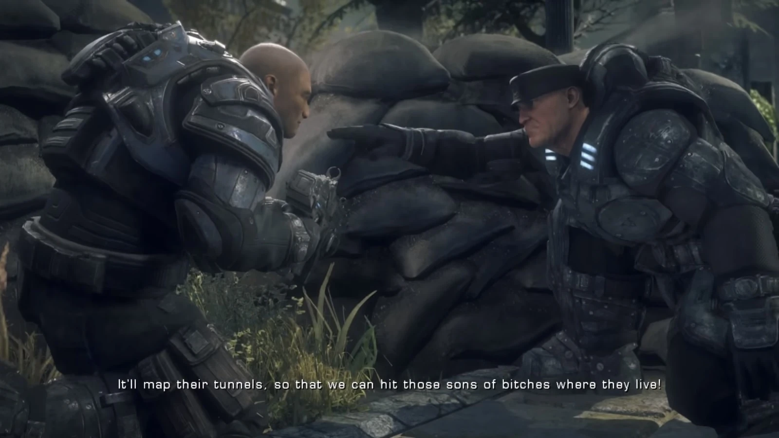 Having eliminated the three Seeders, communication was re-established between Delta, Control, and Alpha Squad. They were contacted by Pvt. Damon Baird, who told Kim that they were pinned down inside the Tomb of the Unknowns by Troikas on the House of Sovereign's rooftop. After fighting through more Locust, they reached the House of Sovereigns main chamber, and Kim remarked to the squad that there was a lot of history in the room. However, Marcus replied that there were also a lot of lies. Kim angrily replied back that he knew about Marcus's trial, and that Marcus has a lot of nerve to say that, but Dom managed to cool them both down.