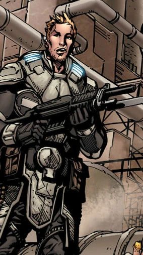 In the 75th year of the Pendulum Wars, Quinn was finished with boot camp, and was assigned to C Company of the 26th Royal Tyran infantry, and placed in a squad under the command of Cpl. Maxon, along with Pvt. Marcus Fenix and Pvt. Carlos Santiago. C Company was assigned to guard the Acastu Imulsion Fields in Dushin, and after disembarking from one of the Corvas that had transported the company, he saw Major Helena Stroud leaning down next to a puddle of Imulsion and remark that that was what they were really fighting for. Quinn said he thought that they were fighting for democracy, but Helena told him that cars didn't run on freedom. He then went on patrol with the rest of the squad, and asked Marcus if his father was really the head of the Defense Research Agency. Marcus confirmed he was, and Quinn asked if he was working on anything cool, but Marcus said his dad didn't tell him about that stuff. Maxon told them that there was a Union of Independent Republics Khimera incoming, and to stay sharp. They saw the helicopter fly over the Imulsion fields, doing a recon of their defenses.[1]