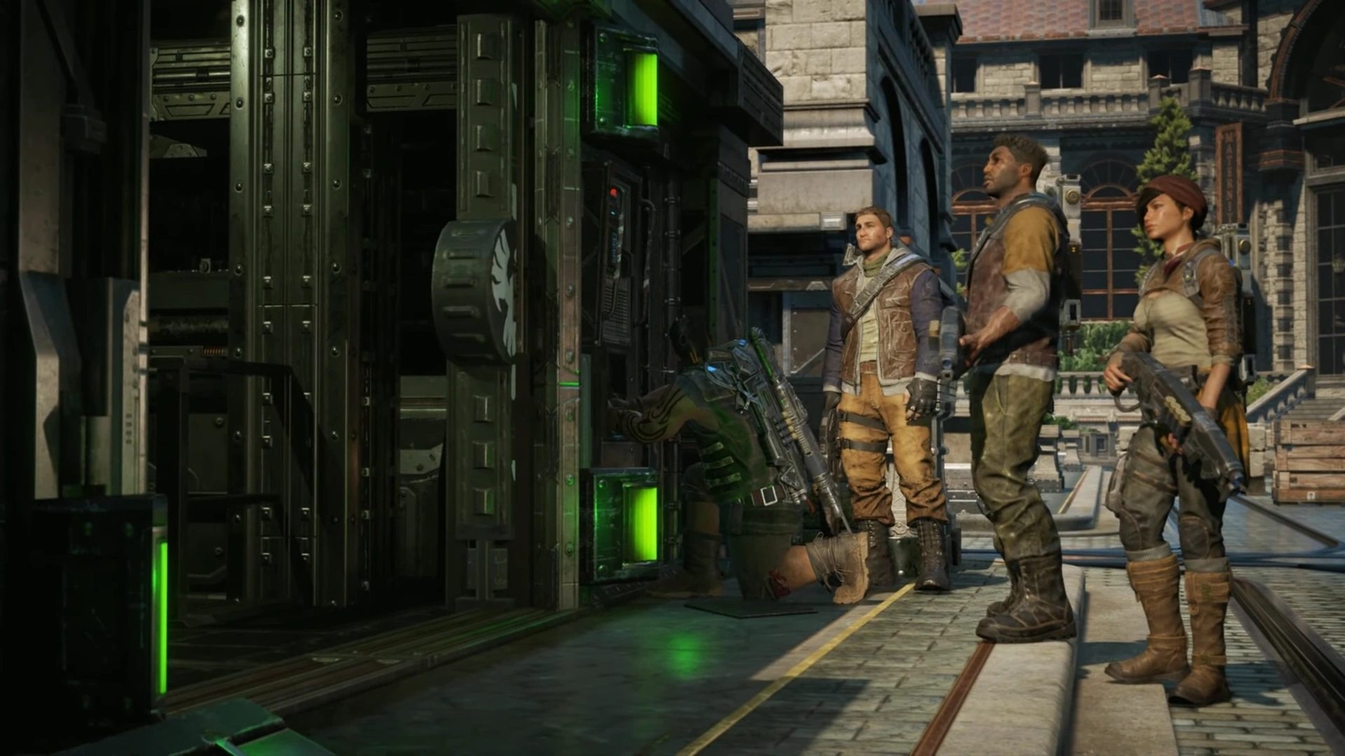 As they entered Settlement 5, Del told the group that every Settlement was built following an identical pattern, meaning that the fabricator should be located in the Construction Hub which was the Settlement's original structure. On their way, Oscar mentioned that he served in the COG Army during the Locust War for 15 years and as a highly decorated veteran, he would like to discuss the conflict with First Minister Mina Jinn personally. Soon after, JD was spotted by a Watcher, causing the Settlement to dispatch a detachment of non-lethally armed Shepherd's to their position. When JD tried to negotiate with the Shepherds, Oscar shot one in the head with his Snub pistol and caused a firefight with the DBs. After another fight with Shepherds and Shock Trackers, the team encountered an obstacle in the form of an automated barrier separating the streets. JD and his friend tried to figure out how to get around it. The barrier lowered itself, leaving the team surprised and confused. They continued and after a series of skirmishes with DBs, they decided to cut through the Maternity Annex. Kait expressed her reluctance to enter the building by saying that she hated being told that she should have a child. JD commented on that by saying that humanity needed to repopulate Sera and Oscar joked that he would like to sign up for a program, leaving his niece disgusted. While exiting the building, JD was spotted by another Watcher and after fighting a few dozen DBs, the team finally made their way to the Construction Hub. Oscar was surprised that JD as someone who served in the COG Army could not access a simple security lock and attempted to do it himself. JD tried to convince him that there was no point in trying since the lock used the state of art COG technology, but before he could even finish, Oscar unlocked the door. Kait told Oscar that she wanted to go inside with Del and JD, but her uncle disagreed. He told the rest that he could not keep the door open for much longer and, before it shut, Kait followed her friends, leaving an angry Oscar alone outside.