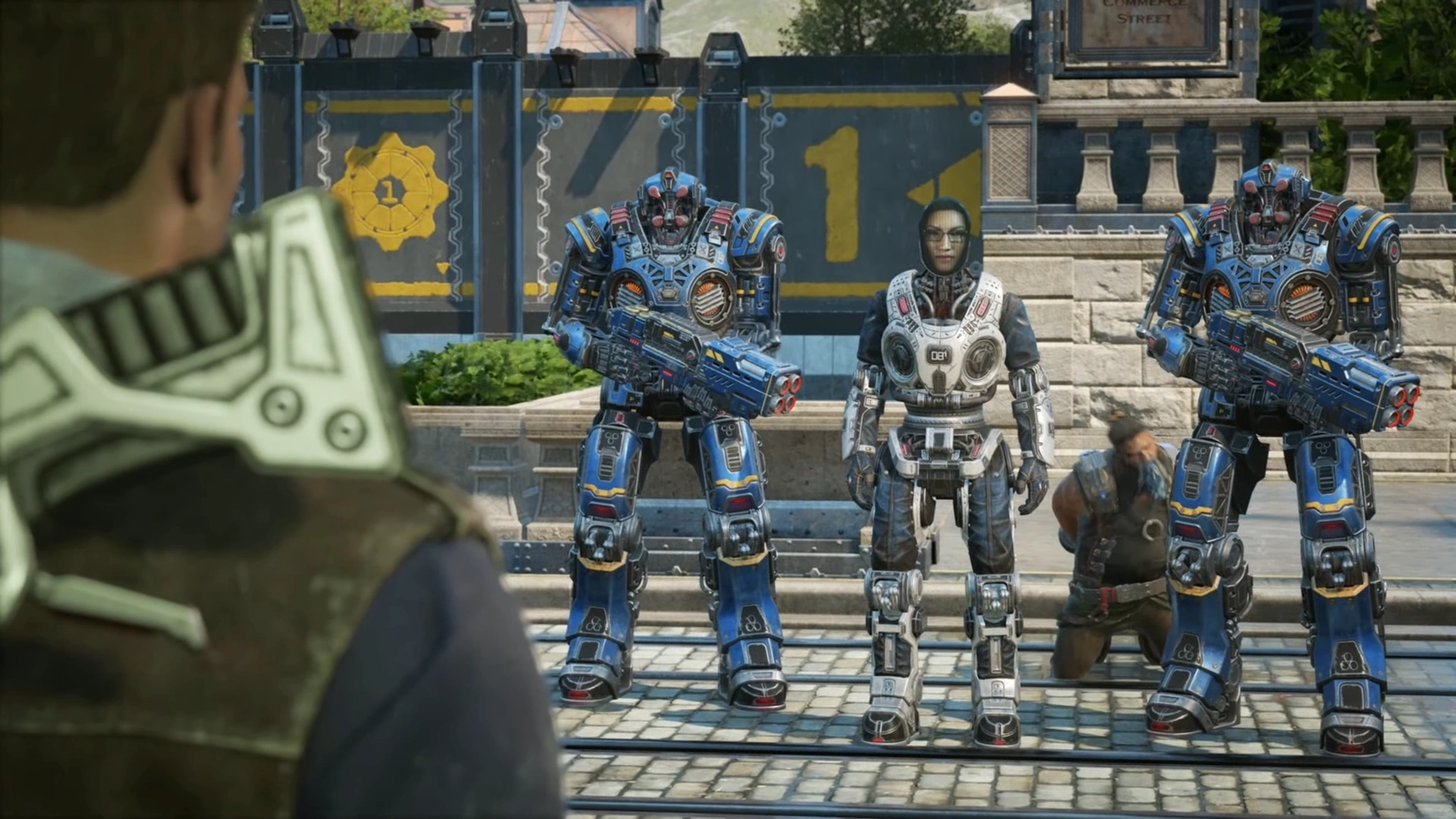 After entering the Hub, JD and Kait headed to it's main lift with Del taking control of it. While the lift traveled to the lower levels of the Hub, Del lost control over it. He reset the power, causing the lift to fall down the shaft in an uncontrolled manner. Annoyed, JD and Kait got off the lift, entered the room containing the fabricator and stole it. As the lift went up, the Settlement continuously tried to stop it and sent multiple waves of DBs against JD and Kait in order to prevent the theft from happening. They quickly dealt with the bots and after regrouping with Del who was also under attack, the Outsiders left the Hub with their objective accomplished. Once on the surface, they found Oscar restrained by a pair DR-1s, a new type of lethally-armed battle DBs and a communication Shepherd, transmitting a broadcast from Mina Jinn. The First Minister accused the Outsiders of kidnapping the COG citizens which made the group confused. Jinn attempted to arrest the raiders, but before the situation could escalate, the DBs are hit by a transport cart that told the group to "GET IN!" via its screen. On their way to the Settlement's border, Del spotted a Condor transport aircraft flying toward them. The plane dropped numerous DB drop pods and one of them hit the cart, causing it to derail. After dealing with the first drop, Kait said that it felt like they started a war and JD responded by saying that they had nothing to do with whatever Jinn was talking about. Oscar mentioned that despite losing his feelings toward the COG, it broke his heart to see the COG use "glorified tinmen" as the bulk of their forces. JD responded to that with a joke by saying that he could re-enlist as there was a few open spots in the COG's officer corps now after JD and Del went AWOL. With the DR-1s, Shepherds, "Deadeye" sniper bots and Trackers, all now carrying lethal arms attacking them, the team managed to make their way back to the Windwall and extract the fabricator out of Settlement 5. Then, they headed toward their village.[1]