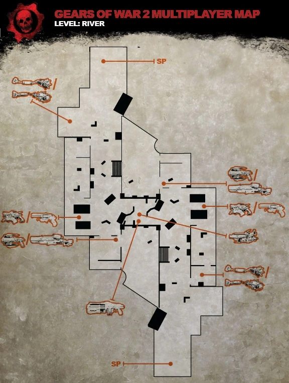 - River was brought back in Gears 5 Multiplayer after a 12 year hiatus. The map hasn’t been seen in the franchise since Gears of War 2 Multiplayer. The map had a slight redesign to fix some errors which was encountered in Gears of War 2. Such as sniper pinching points and unbalanced cover. Most of all the original weapon placements remained the same with the exception of the Mortar, which was replaced on top of the bridge with the Scorcher Flamethrower and Bolo Grenade's over the 2 round period, and the Ink Grenade, which was replaced by the Boltok Pistol.