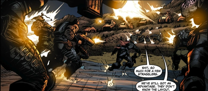 Later, inside Adam Fenix’s lab, Adam tried gathering his paperwork, but Nevil told him that he needed to leave. But soon, a group of Drones breached the room and opened fire on him and his staff, but Nevil covered him with his Lancer. Queen Myrrah ordered no human in a white coat to be harmed since the COG was planning something on the island and she needed to know what. While Adam retreated to the top of the Pinnacle Tower, Nevil placed snipers on top of the tower and the Onyx Guard fortified the front doors. Deep inside the island, Dury and Prescott are held up in an elevated position trying to reach Adam and Nevil. Queen Myrrah was able to listen in on their conversation.