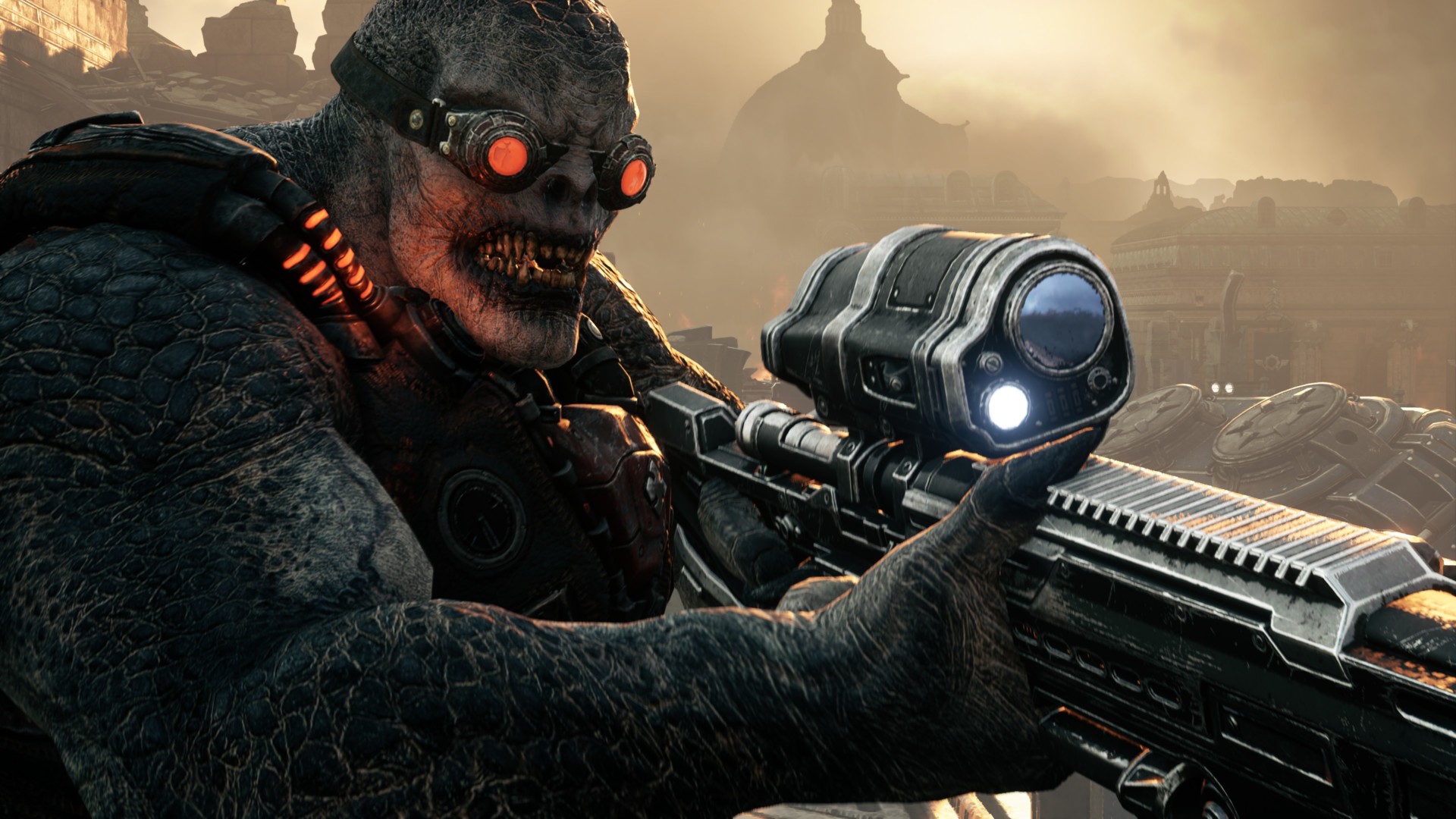 A Locust Sniper wielding a Longshot Sniper Rifle.