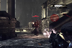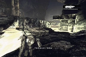 These new Locust soldiers called Theron Guards. They are tougher than usual, and many of them are armed with the same Torque Bow weapon you've got equipped. Be very careful against these guys, as one shot from the bow is enough to kill you on Hardcore and Insane. If you see an enemy readying the Torque Bow—you'll know it by the glowing dot that appears in front of them as well as the creepy whisper of the Theron that indicates he's loaded—stay crouched and wait for the shot to fire before peeking out to shoot back.